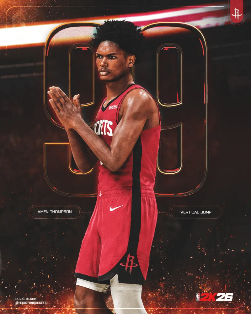 “阿门-汤普森拥有2K中最高的垂直弹跳评分😱⏫!”火箭官方附文道。