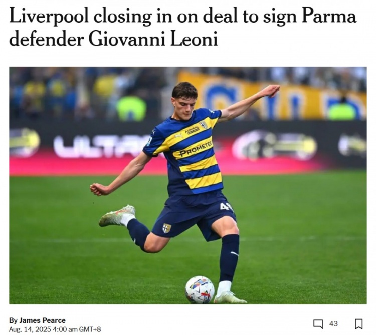 TA:利物浦接近签下帕尔马中卫莱奥尼 初始转会费2600万镑