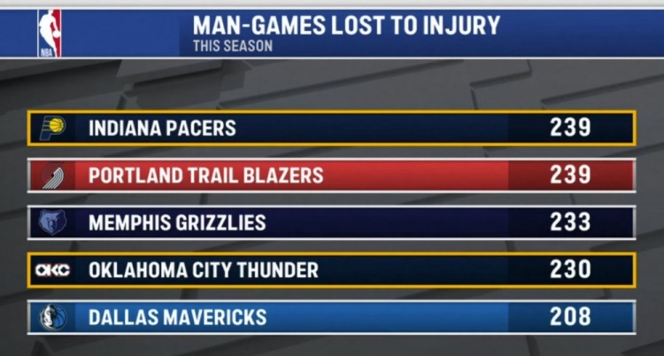 pg电子-本赛季伤缺人次:步行者&开拓者239次并列第一 熊&雷&侠三到五